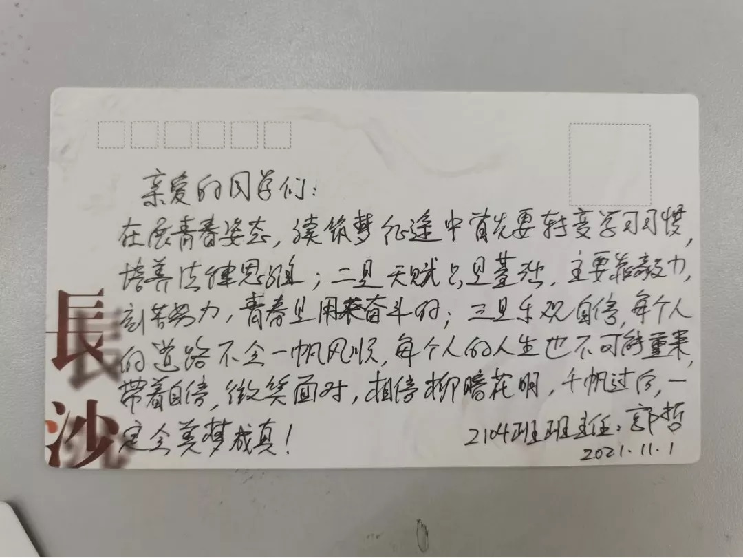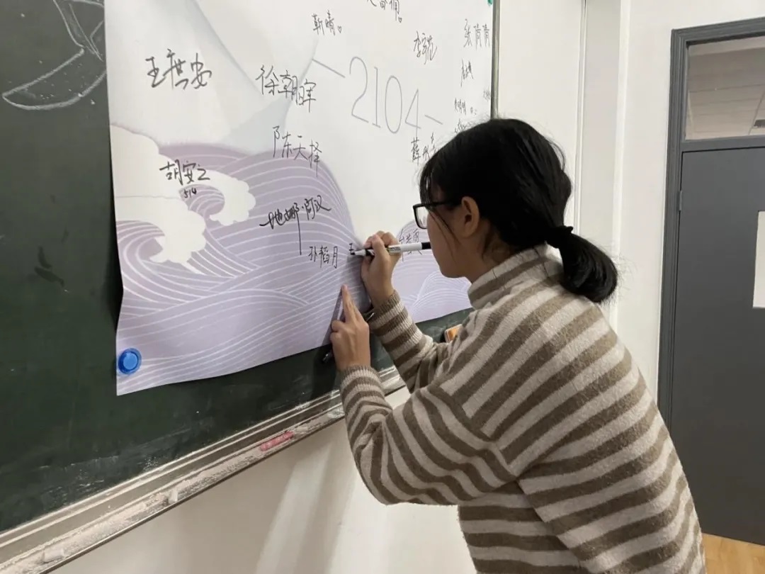 很快,班会进程来到第四项:以梦为马,不负韶华。全体同学将写上了自己梦想的明信片放入时空胶囊保存,并在签名墙上签下自己的名字,两位老师作为见证人也一同签名并分别写下了对同学们的期许。