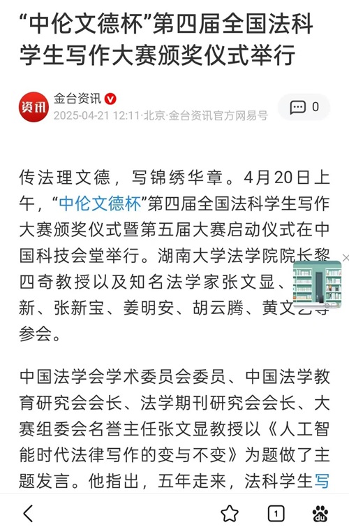 “中伦文德杯”第四届全国法科学生写作大赛颁奖仪式暨第五届大赛启动仪式的成功举办引发全国媒体密集报道。据不完全统计,已有《法治周末》《湖南日报·新湖南》《三湘都市报》及红网、金台咨讯、搜狐网、人民网—湖南频道、科学网、法学学术前沿、教授加、湘江法学等全国多家媒体或机构推出相关报道。特此辑录相关媒体并致谢。 相关媒体报道截图: