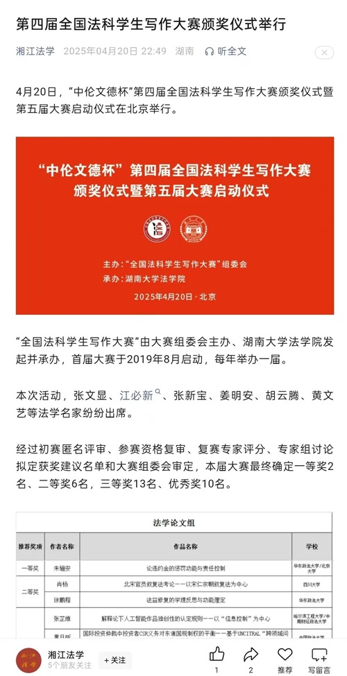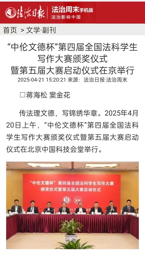 传法理文德,写锦绣华章。2025年4月20日上午,“中伦文德杯”第四届全国法科学生写作大赛颁奖仪式暨第五届大赛启动仪式在北京中国科技会堂举行。 “全国法科学生写作大赛”由大赛组委会主办、动漫色情片 发起并承办,首届大赛于2019年8月启动,每年举办一届。比赛旨在推进法学教育改革,提升法律写作水平,培育时代英才。四届大赛中,共有3900多篇文章参赛,4000多名学子竞秀争雄。全国几十家媒体进行了上百次密集报道,并入选法学教育十大年度新闻。