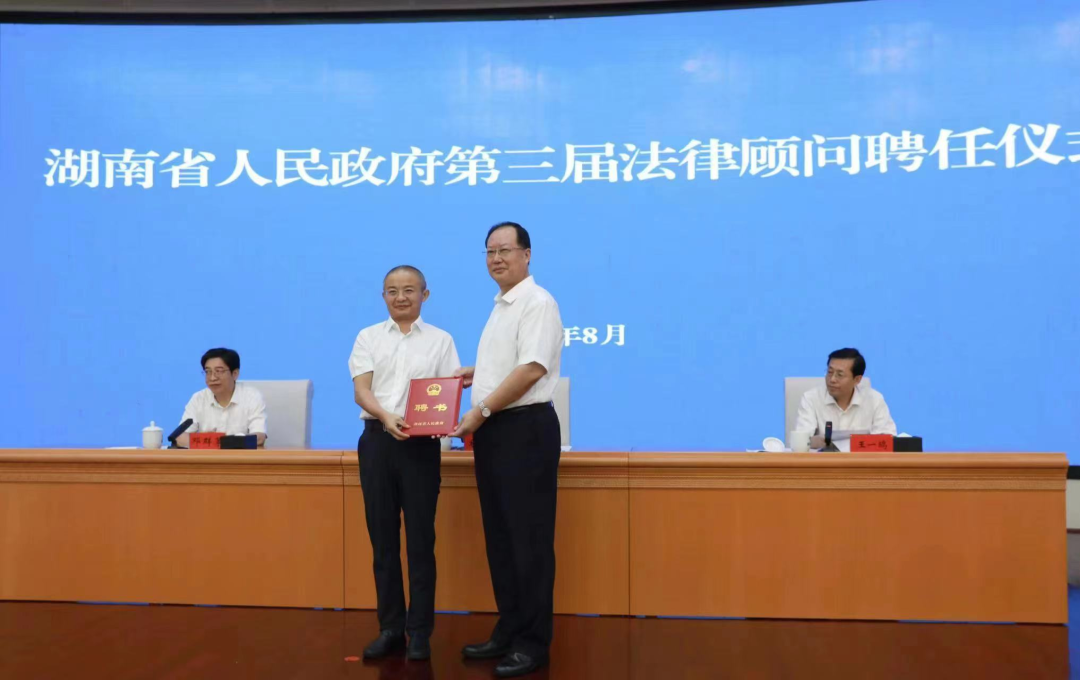 院长黎四奇教授受聘为省政府法律顾问。聘任仪式上,省委副书记、省长毛伟明亲自向黎四奇院长颁发了聘书。