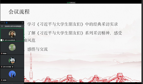 为培育同学家国情怀,凝聚班级奋斗意识,法学2002班团支部于2022年4月29日晚线上组织开展了有关《习近平与大学生朋友们》一书的专题学习活动。会前,全班同学阅读相关材料,并形成了一定的思想认识。正式活动分为学习、分享与展示三个环节。活动由团支书陈翔宇领学。