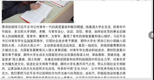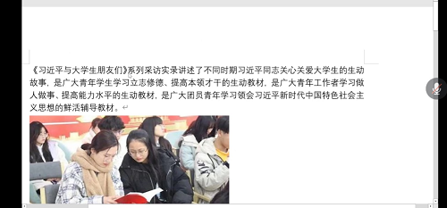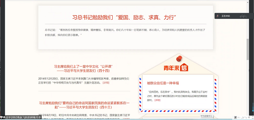 第一个环节,宣传委员刘宇彤带领同学们浏览《习近平与大学生朋友们》中“习总书记嘱咐我们‘人生的扣子从一开始就要扣好’”等章节内容。