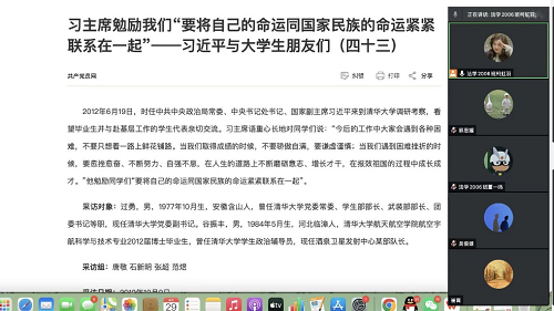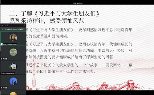 2022年4月29日晚十点,法学2004班团支部在团支书彭敬茹的带领下开展了《习近平与大学生朋友们》主题学习活动,全员参会。