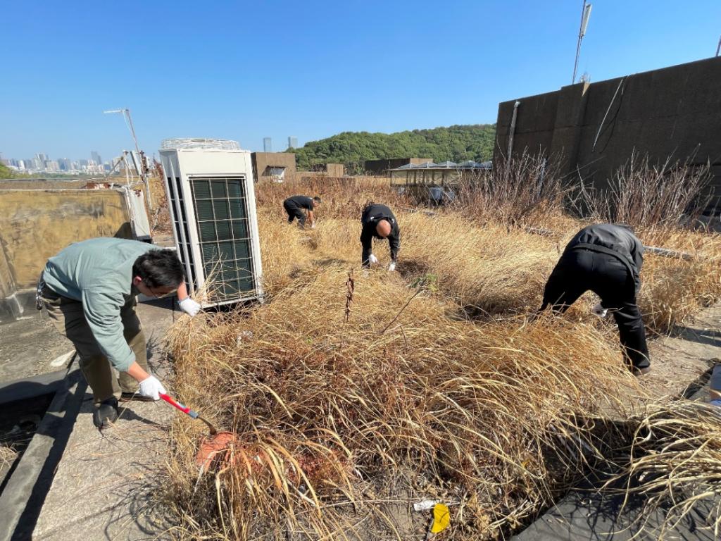 经过一个下午的辛勤劳动,整个顶楼杂树杂草都被砍倒并集中堆放,并将在第一时间请人转运出去,基本根除了安全隐患。