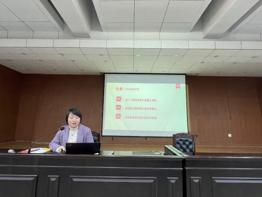 在报告厅举行2021年度下学期第二次全体教职工政治理论学习,院党委副书记、纪委书记罗英带领大家认真学习党的十九届六中全会精神。