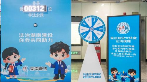 地铁站参观全省“八五”普法及“谁执法谁普法”工作成果展,乘车体验宪法主题地铁专列。