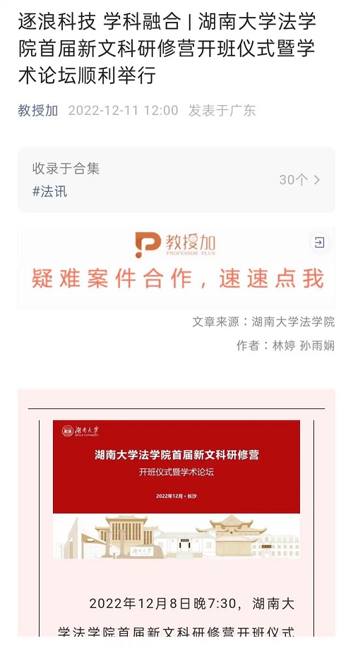 首届新文科研修营开班》,《法治日报·法治周末》推出报道《法学教育如何应对新文科》,知名法学公众号“法学学术前沿”推出报道《学界 | 全国法学界第1个新文科研修营 动漫色情片