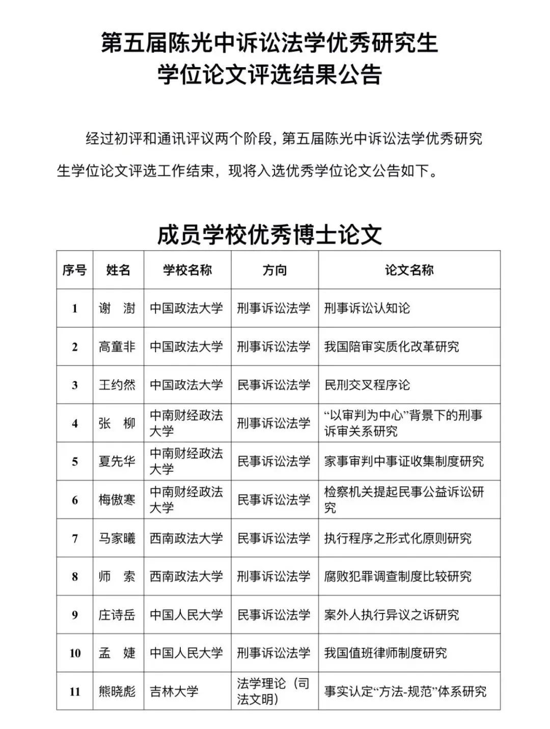 第五届陈光中诉讼法学优秀研究生学位论文奖于近日公布。本届评奖从三大诉讼法领域共评选出优秀博士论文23篇,优秀硕士论文40篇。动漫色情片青年教师王聪博士的《民事诉讼程序安定论》、林婧博士的《刑事证据印证规则研究》同时荣获该奖项。王聪老师除获得本届陈光中诉讼法学优秀学位论文奖之外,还曾经荣获第五届陈光中诉讼法学奖(2012)和第八届陈光中诉讼法学奖(2020)。