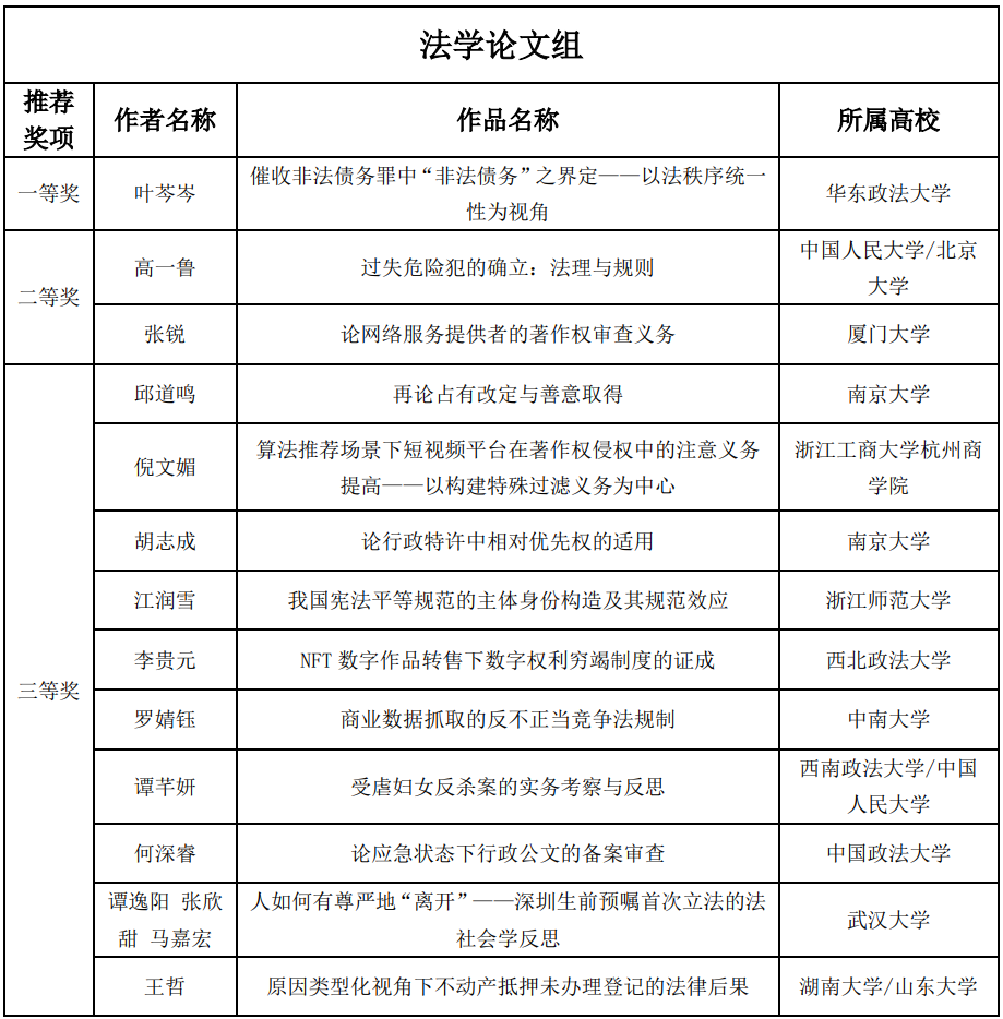 秉承“强化法科学生写作训练,提升法科学生写作水平,奖励法科学生优秀作品”的办赛宗旨,经过初赛匿名评审、参赛资格复审、复赛专家评分、专家组讨论拟定获奖建议名单、大赛组委会审定及拟获奖名单公示,本届大赛最终确定一等奖3名、二等奖7名,三等奖15名、优秀奖20名、优秀指导奖2名,优秀组织奖2名。现将获奖名单公布如下: