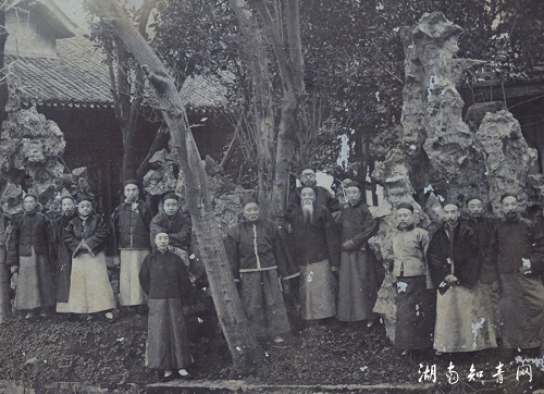 1910年3月18日,十四位湘绅在长沙郭园合影。左起谢重斋、周大烈、王莘田、曾广钧、杨钧(最前者)、谭延闿(蹲坐者)、廖树蘅、王闿运(蓄长白须者)、胡元倓(戴眼镜者)、杨度、梁焕奎、龙璋、胡子清(右二)、黄忠绩。