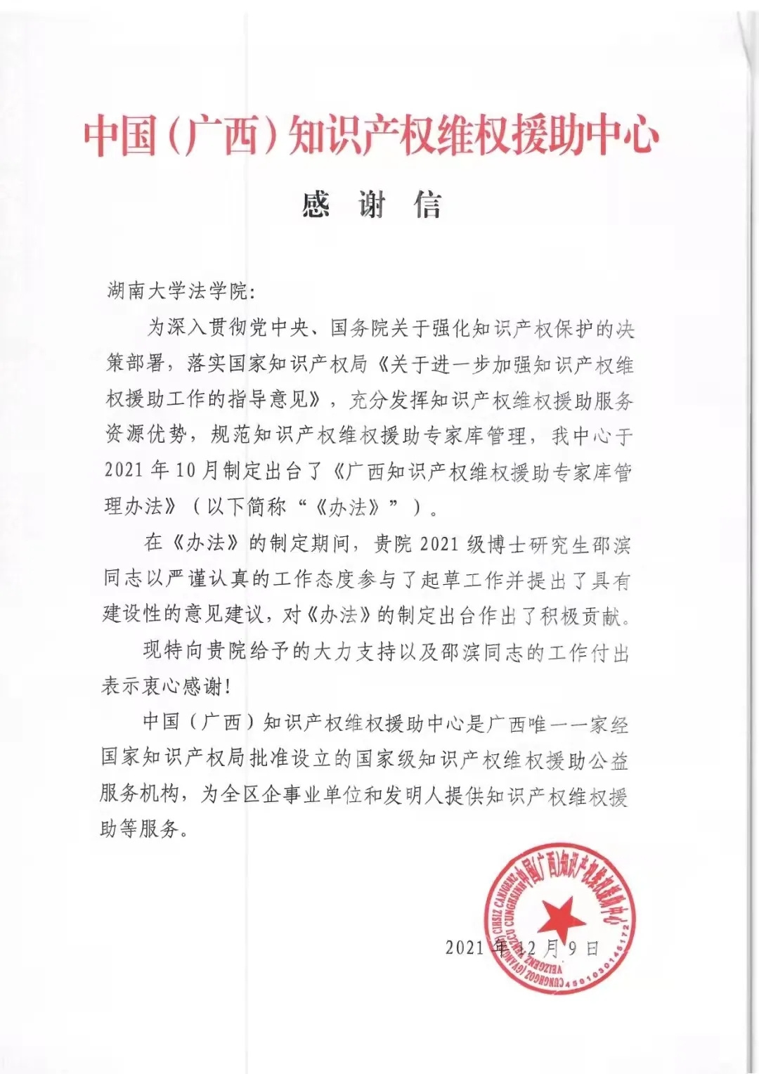 中国(广西)知识产权维权援助中心在信中提到“在《办法》的制定期间,贵院2021级博士研究生邵滨同志以严谨认真的工作态度参与了起草工作并提出了具有建设性的意见建议,对《办法》的制定出台作出了积极贡献。现特向贵院给予的大力支持以及邵滨同志的工作付出表示衷心感谢!”