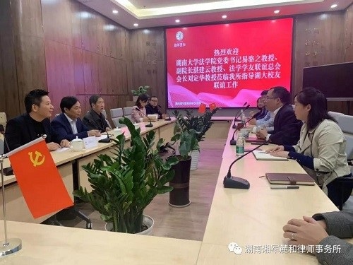法学学友联谊总会会长刘定华教授、副院长湛建云等来到湘军麓和所开展湖大校友联谊工作。)